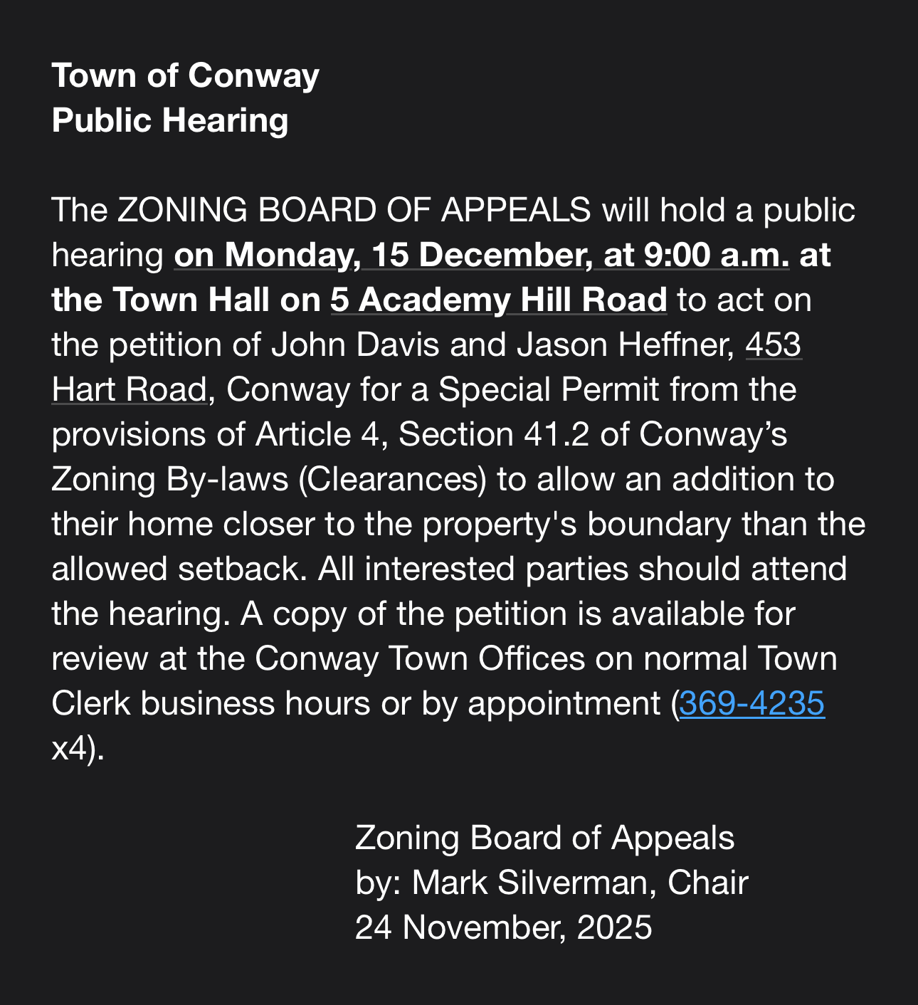 The Town of Conway (37.8 square miles) lies in the foothills of the Berkshires just west of the Connecticut River Valley, a region rich in agriculture, arts & culture. Conway is the 4th largest in area of all towns in Franklin County and is the 11th most populous (1990 census). This site is maintained by local town officials and meant to be a resource to residents and visitors alike.